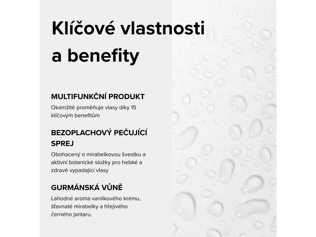 Bezoplachový pečující sprej pro všechny typy vlasů. Okamžité zlepšení struktury vlasů a mnohem více! Tento sprej kombinuje celkem 15 výhod pro vlasy. Obohacený o olej z mirabelkových jader a aktivované rostlinné látky.