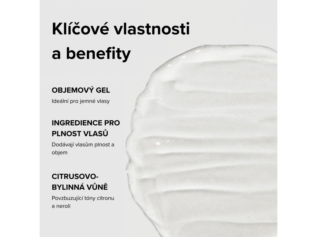 Zahušťující gel ideální pro jemné vlasy, který dodává účesu objem, tvar a flexibilní kontrolu bez slepení a bez šupinek. Jeho složení s objemotvornými ingrediencemi pomáhá vlasům dodat plnost a zahuštění, zatímco pružná fixace umožňuje vytvořit na dotek přirozený, prokartáčovatelný účes. Vlasy zůstávají poddajné, lehké a snadno upravitelné po celý den. Gel má svěží citrusově-bylinnou vůni s energizujícími tóny citronu a neroli a je skvělou volbou pro dlouhotrvající objemné účesy.