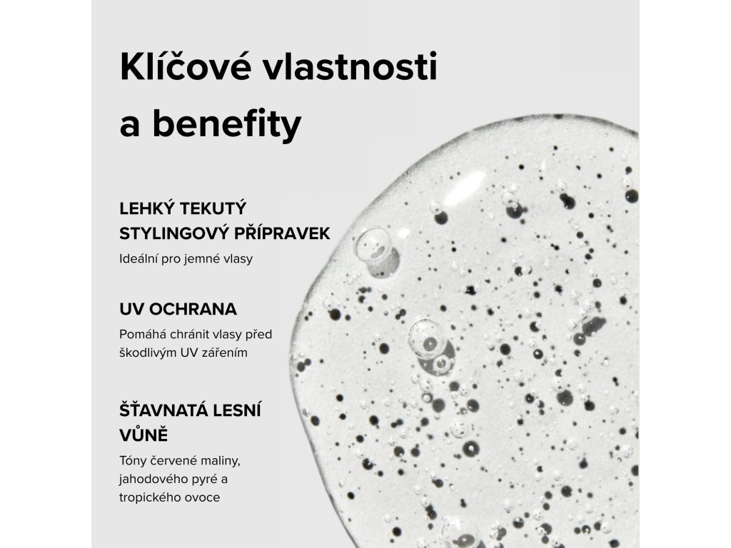 a přitom zachovává jejich přirozenou pohyblivost. Obsahuje složky chránící vlasy před UV zářením, které pomáhají minimalizovat poškození vlivem slunce. Voní po lahodné směsi lesních plodů, zahrnující maliny, jahodové pyré a tropické ovoce.