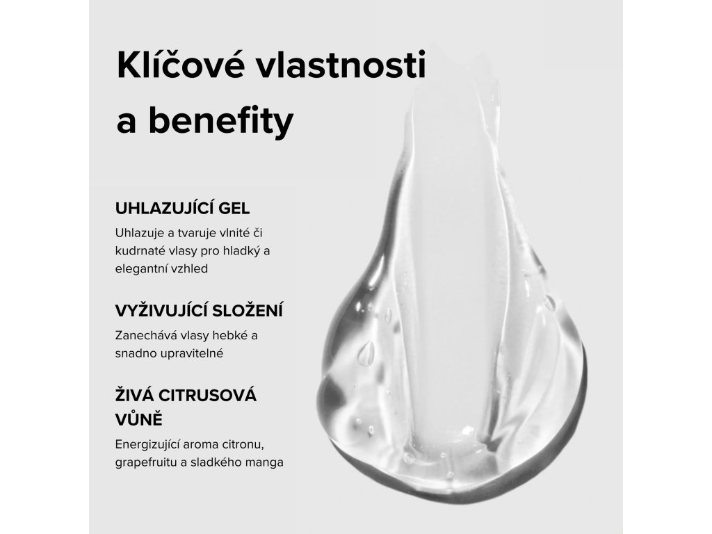 Nezatěžující gel. Uhlazuje přirozeně vlnité nebo kudrnaté vlasy. Pomáhá zanechat vlasy hebké, hladké a rovné.