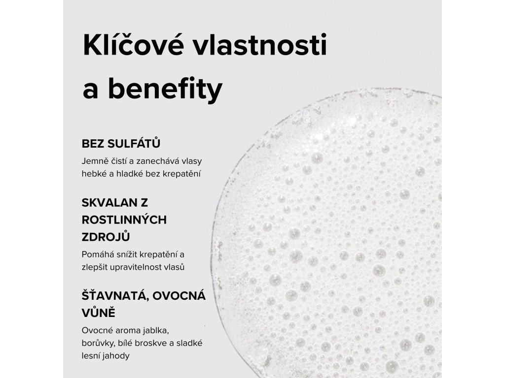 Šampon s účinkem proti frizzu. Dodává vlasům hebkost, zlepšuje ovladatelnost a pomáhá redukovat frizz. S rostlinným skvalanem z oliv.