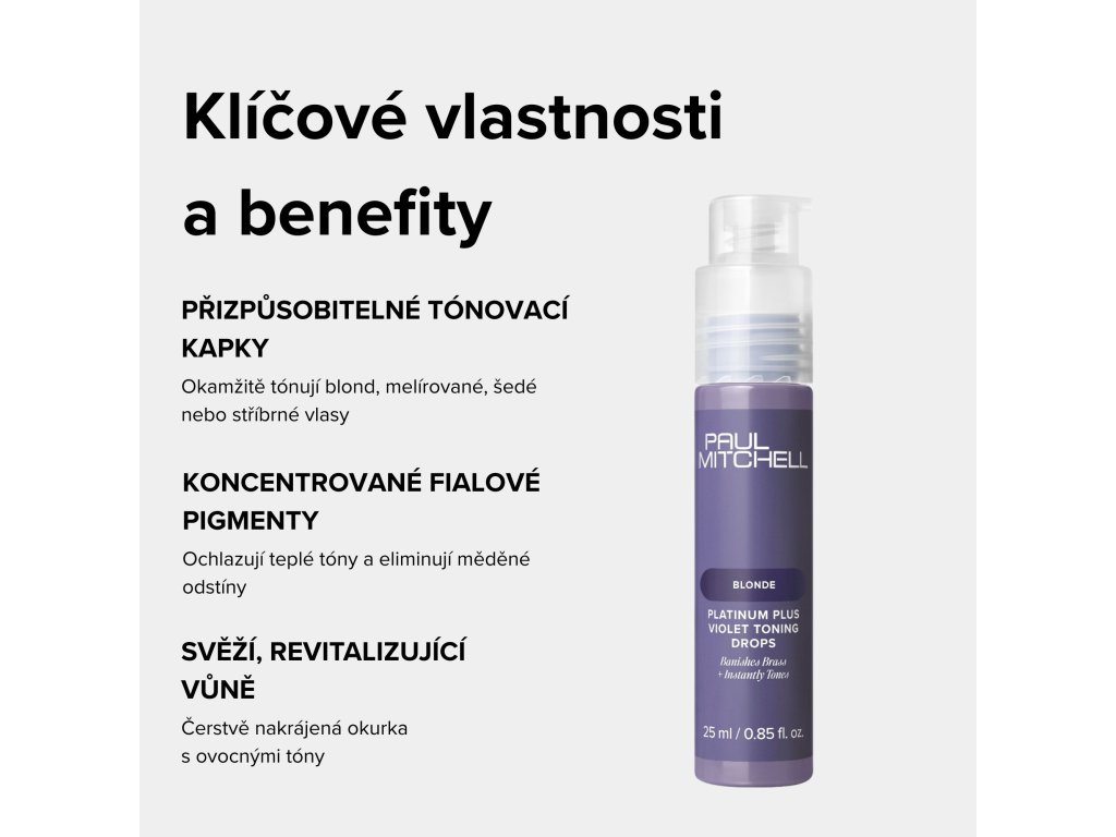 Vlastnosti: Ideální pro blond, melírované, šedé nebo stříbrné vlasy. Koncentrované fialové pigmenty ochlazují teplé tóny a eliminují měděné odlesky.