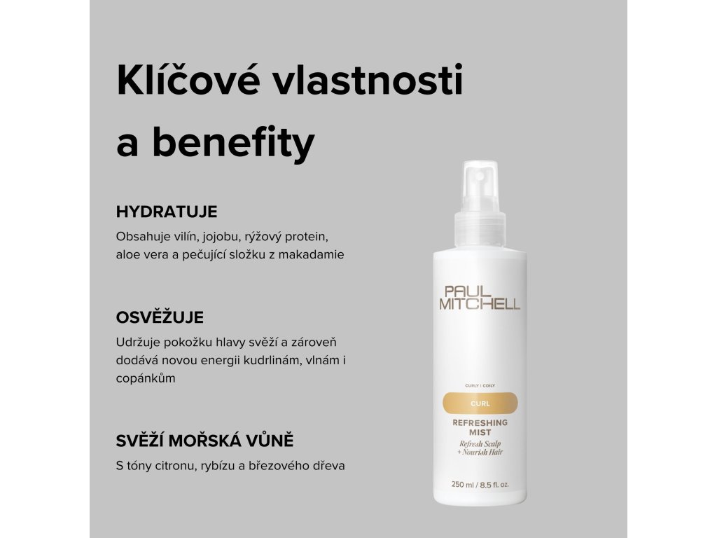 Vlastnosti: Ideální pro lokny, copy a ozdobné účesy. Nezatěžující sprej s micelární vodou čistí a osvěžuje pokožku hlavy. Výživné složky pomáhají vlasy regenerovat a eliminovat frizz.