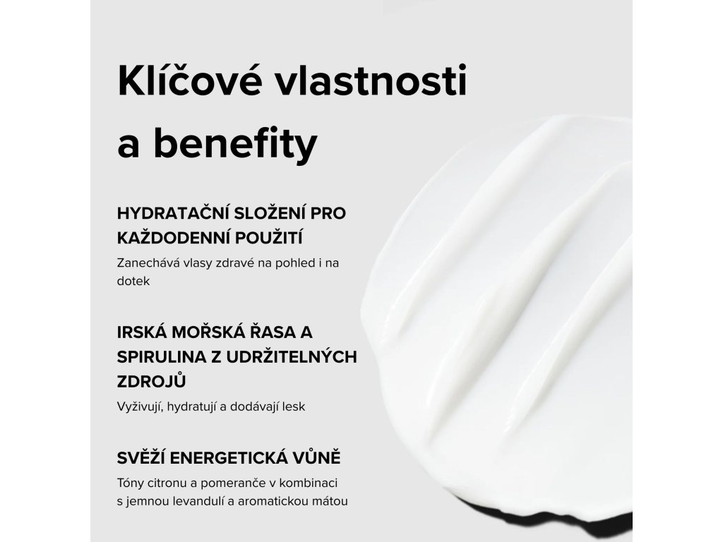 Vlastnosti: Hydratační kondicionér ideální pro oživení suchých vlasů a prevenci jejich poškození. Irský mořský mech a spirulina z udržitelných zdrojů vyživují, hydratují a dodávají lesk.
